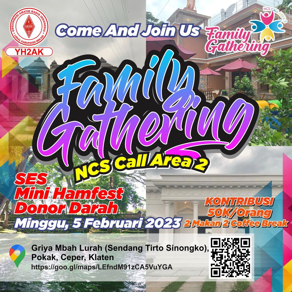 Sebanyak 1.200 orang anggota orari dan simpatisan orari dari berbagai Kabupaten/Kota dan Propinsi Se-Indonesia, akan hadir di acara Family Gathering Family Gathering NCS Call Area 2, SES, Mini Hamfest, Donor Darah dan Unar pada Sabtu-Minggu (4-5/1/2023) dan berkumpul di Griya Mbah Lurah (Sendang Tirto Sinongko) Pokak, Ceper, Kabupaten Klaten, Propinsi Jawa Tengah.